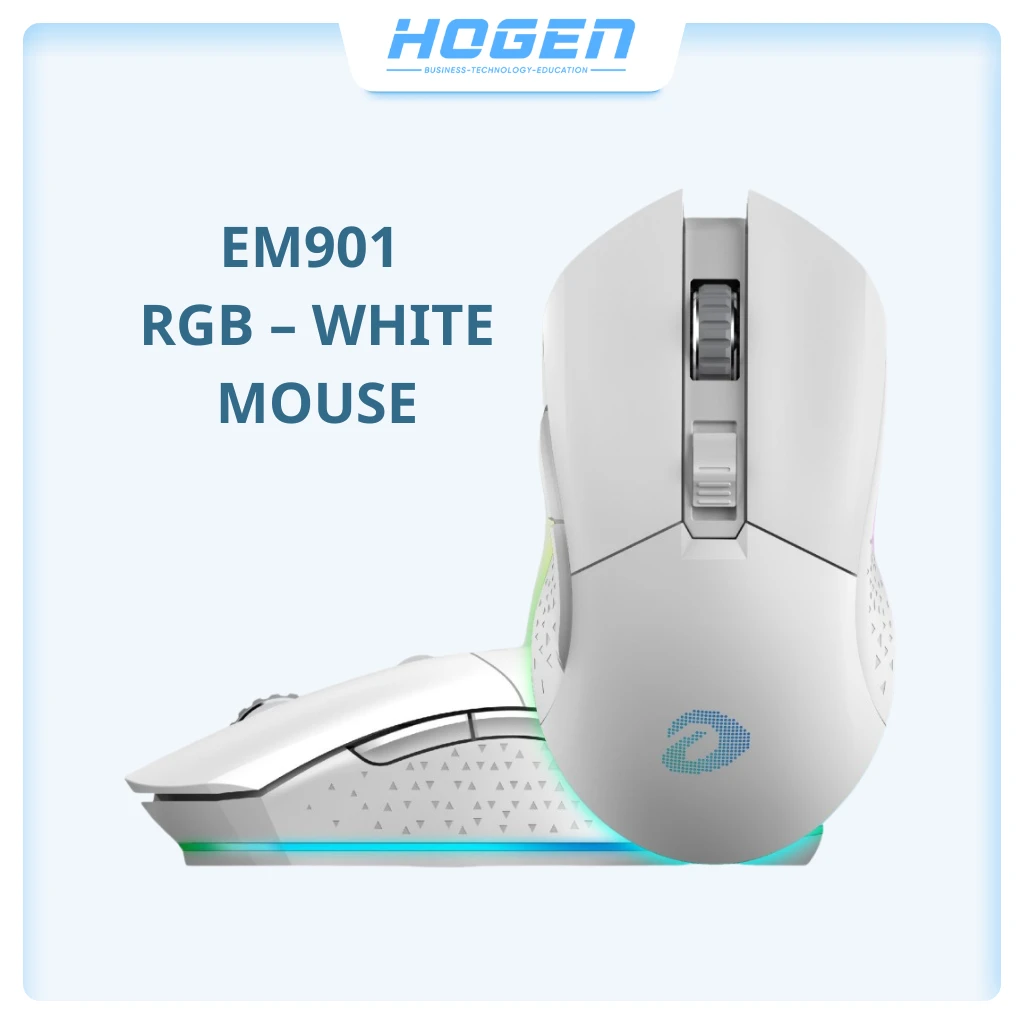 DAREU EM901 RGB – White: chuột gaming 2.4G + USB, DPI tối đa 6.000, 1.000 Hz, switch 20M, RGB 16.8M, pin ~600 mAh, 6 nút, ~90 g, cáp 1.8 m. Nhẹ – linh hoạt – sáng đẹp cho mọi setup.